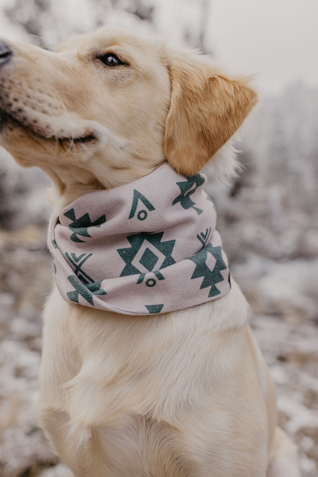 Inspired by quiet pine forests and fresh snow underfoot, this forest green + cream Aztec Bandeau Scarf is a little bit wild and a whole lot timeless. The deep green pattern pops against the soft cream background, giving your pup that “cozy lodge, but make it adventure” look—perfect for winter hikes, weekend cabin runs, and every photo where they’re clearly the main character.