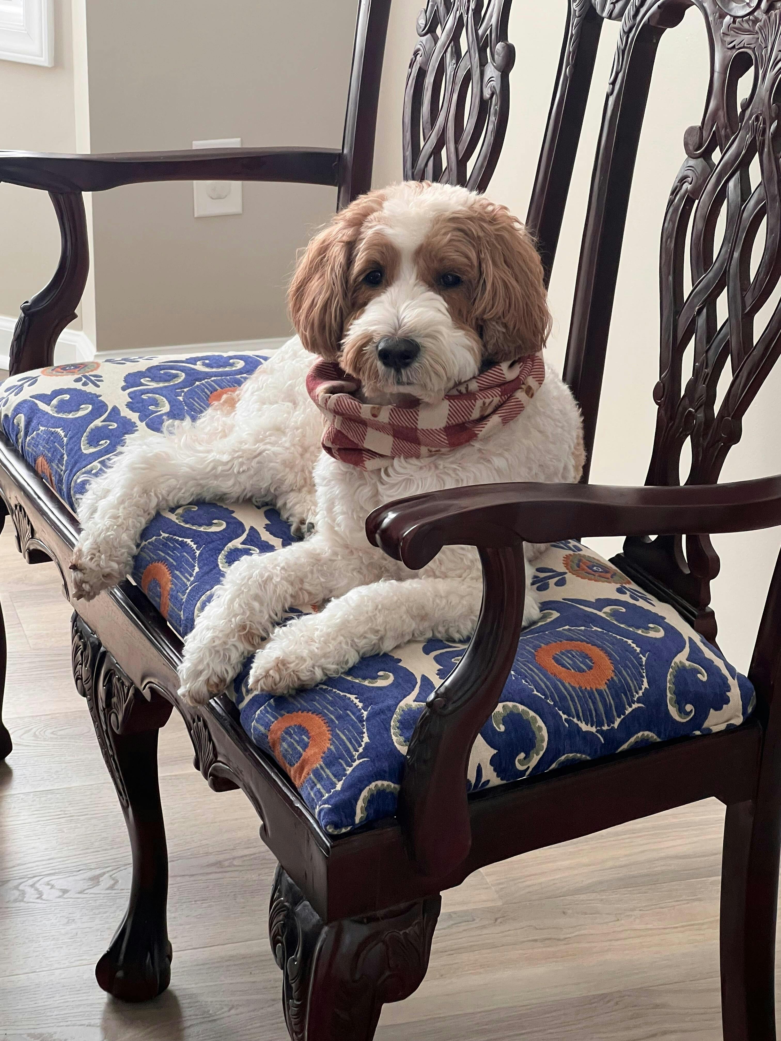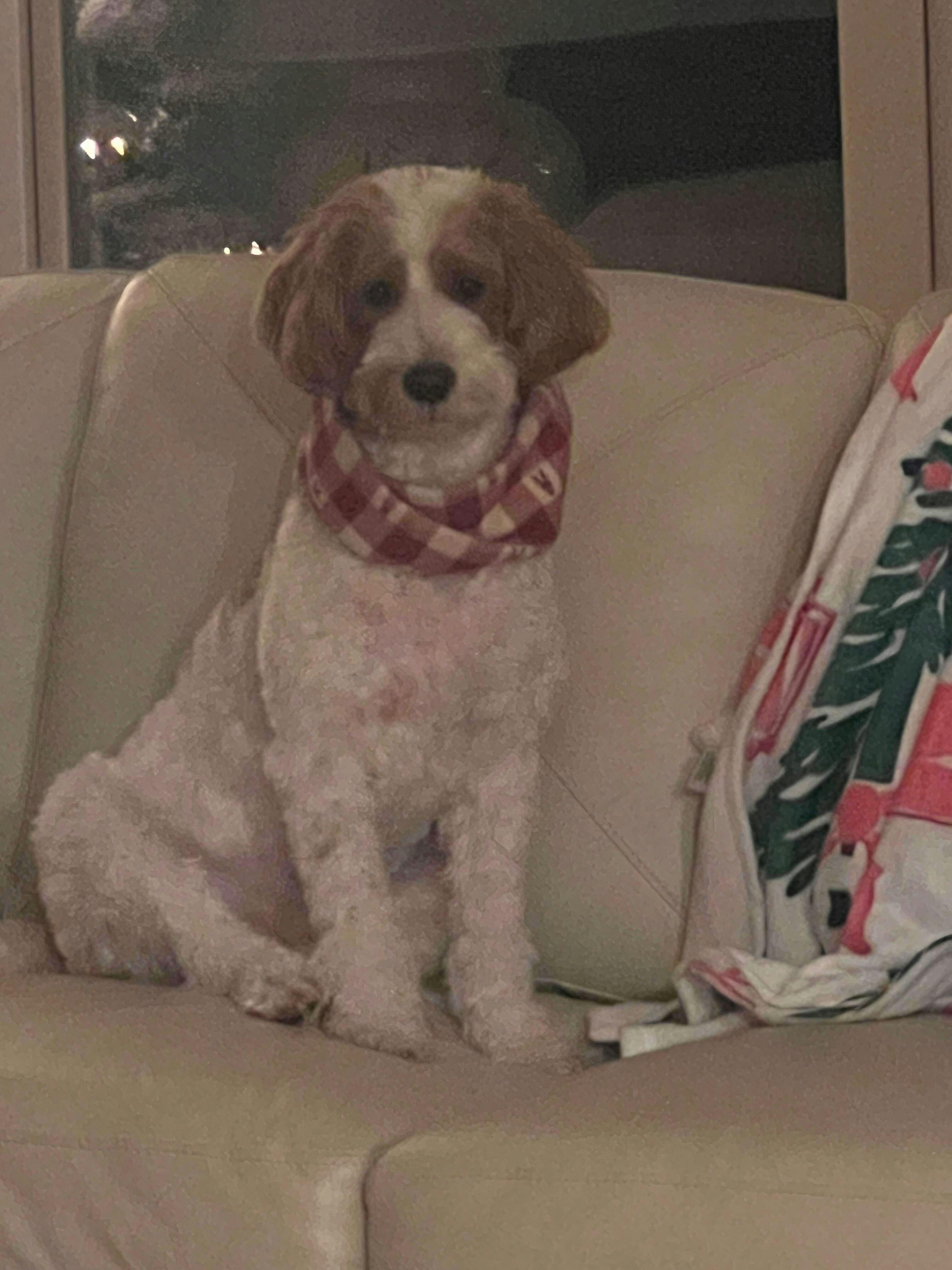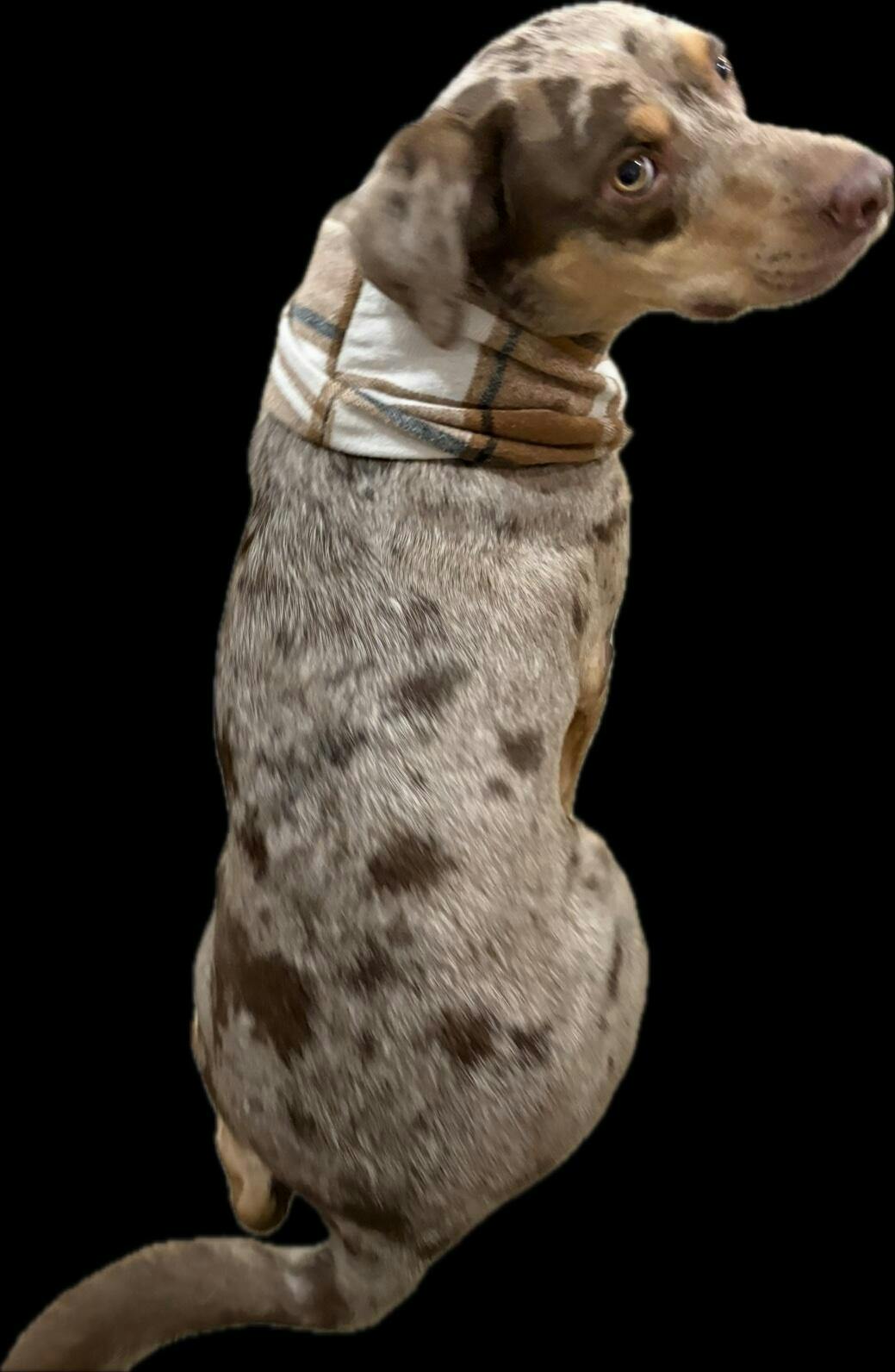 Love the new scarf for my sweet pup. It fits perfectly & is well made. Great plaid fabric!