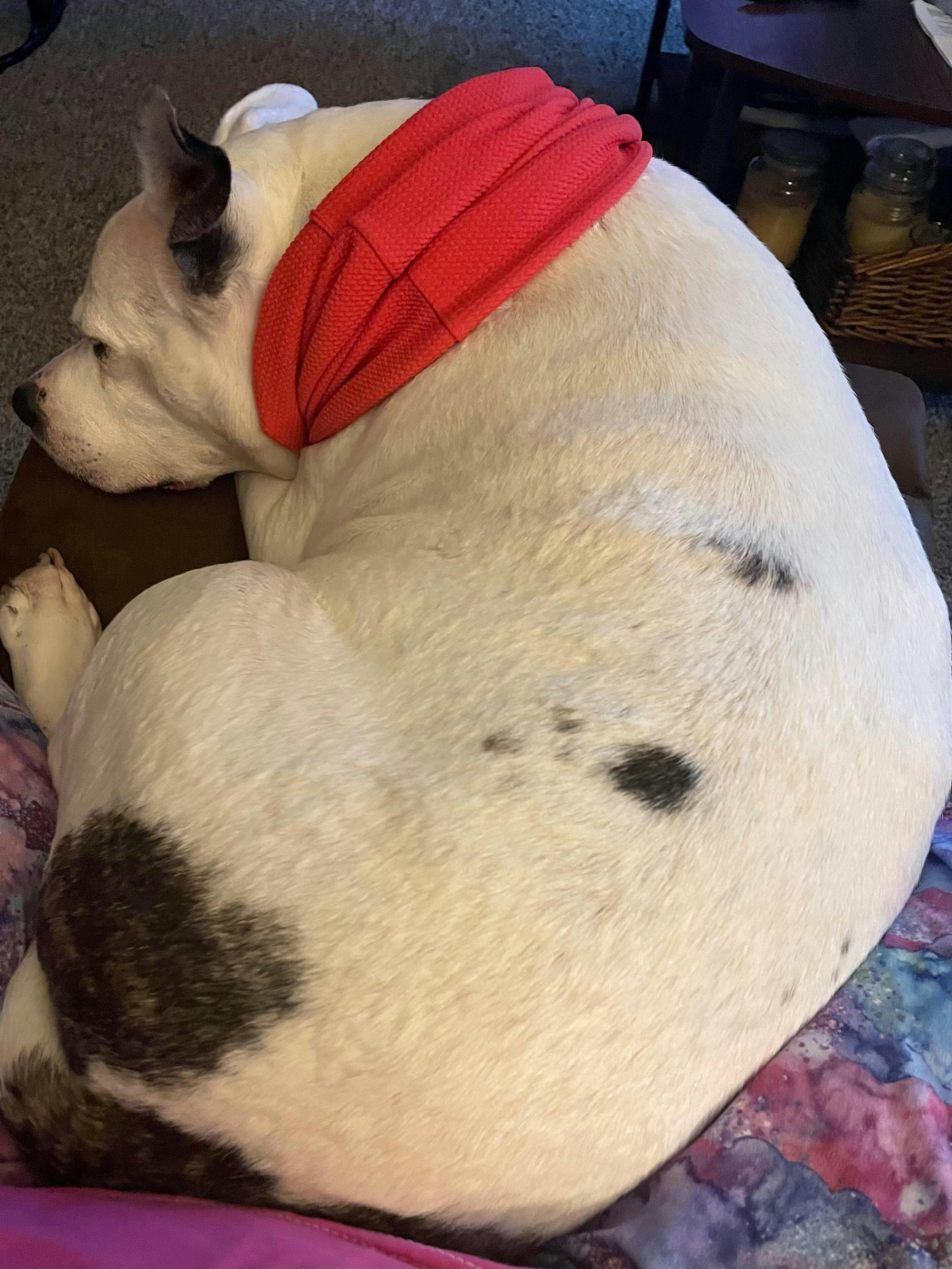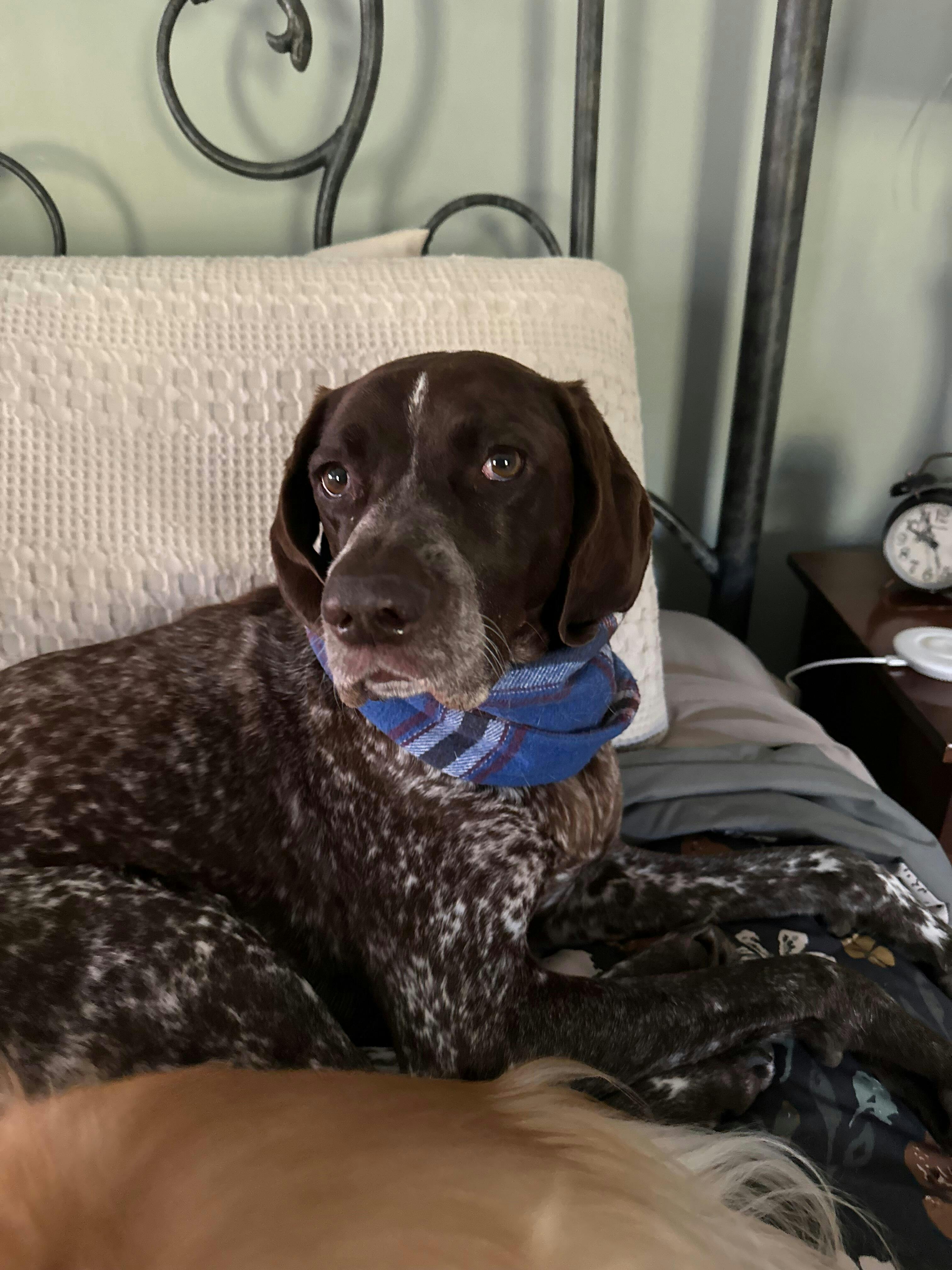 My GSP looks sharp in the blue scarf! It adds a little warmth while covering her unsightly correction collars. Large was just right for her at 50lbs but also fits my 70lb Golden.